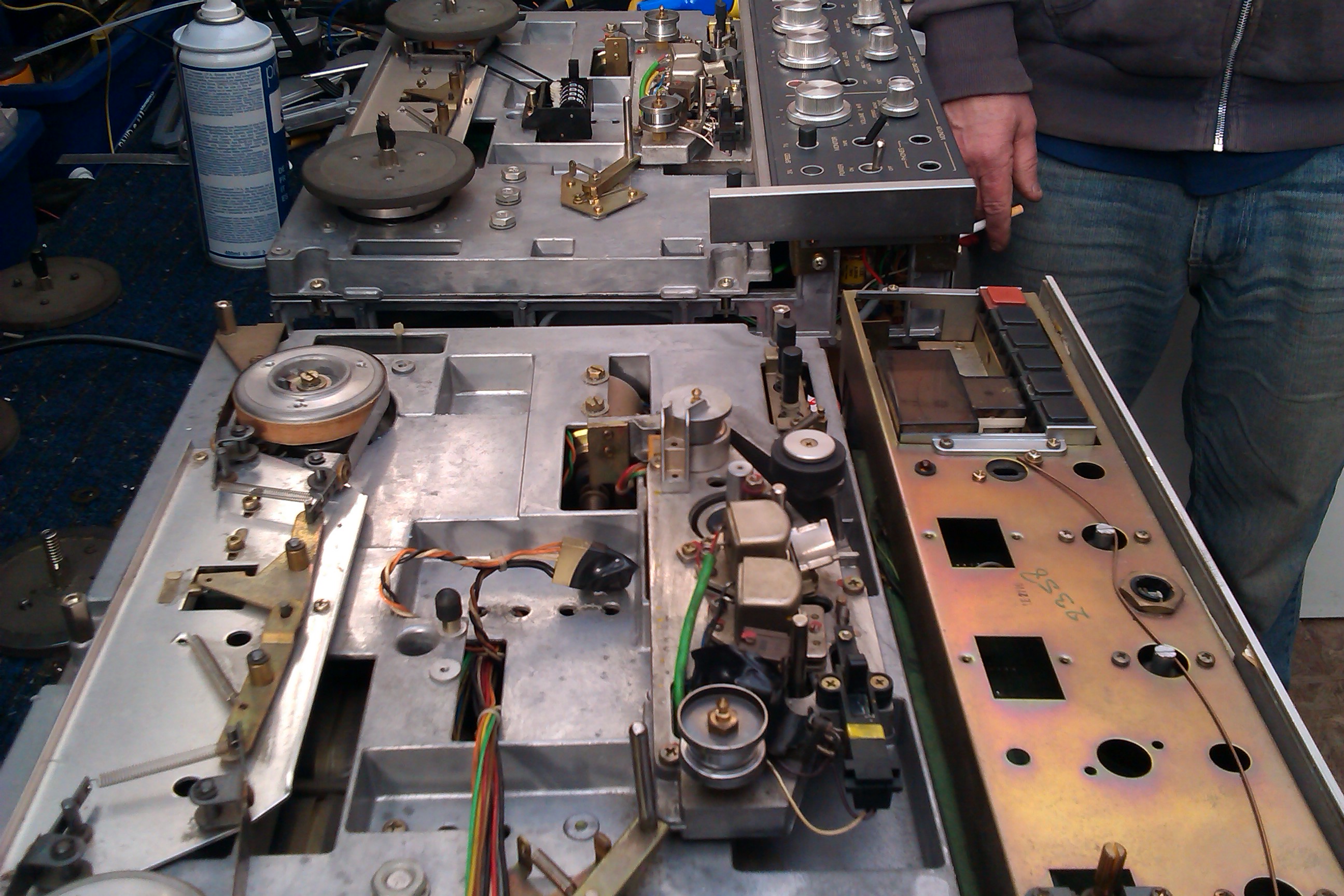 In the same week that we were booked for a major gig later on this year, I’m happy to announce that Howlround have finally made some progress on the tape machine front, as Chris and I journeyed to deepest Sussex yesterday to visit the home of reel-to-reel repair expert Paul Baldwin. We took three dodgy tape machines under our arms/in the boot, plunderphonic overlord Lepke B rode shotgun and the two-hour journey simply flew by thanks to one of Chris’s bizarre and confusing compilation CDs consisting entirely of Squarepusher, extreme metal and Ceefax music.