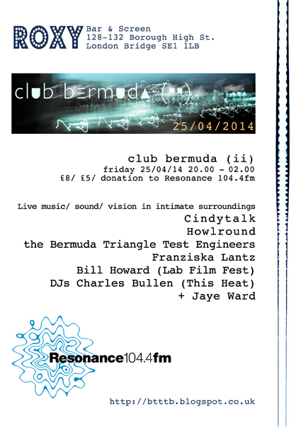 Very excited about this weekend, when Howlround will be spooling up for a live performance at the Roxy Bar and Screen as part of Club Bermuda ii. And a fantastic line-up too, including Cindytalk, Charles Bullen of This Heat and Franziska Lantz, who you might remember from our collaboration for Radio 3’s Late Junction a few months back. There’s also a Facebook Events Page for those of a social media disposition. All proceeds go to help keep Resonance FM on air and if the previous event is anything to go by, it promises to be a memorable evening for everyone concerned. Hope to see you there.