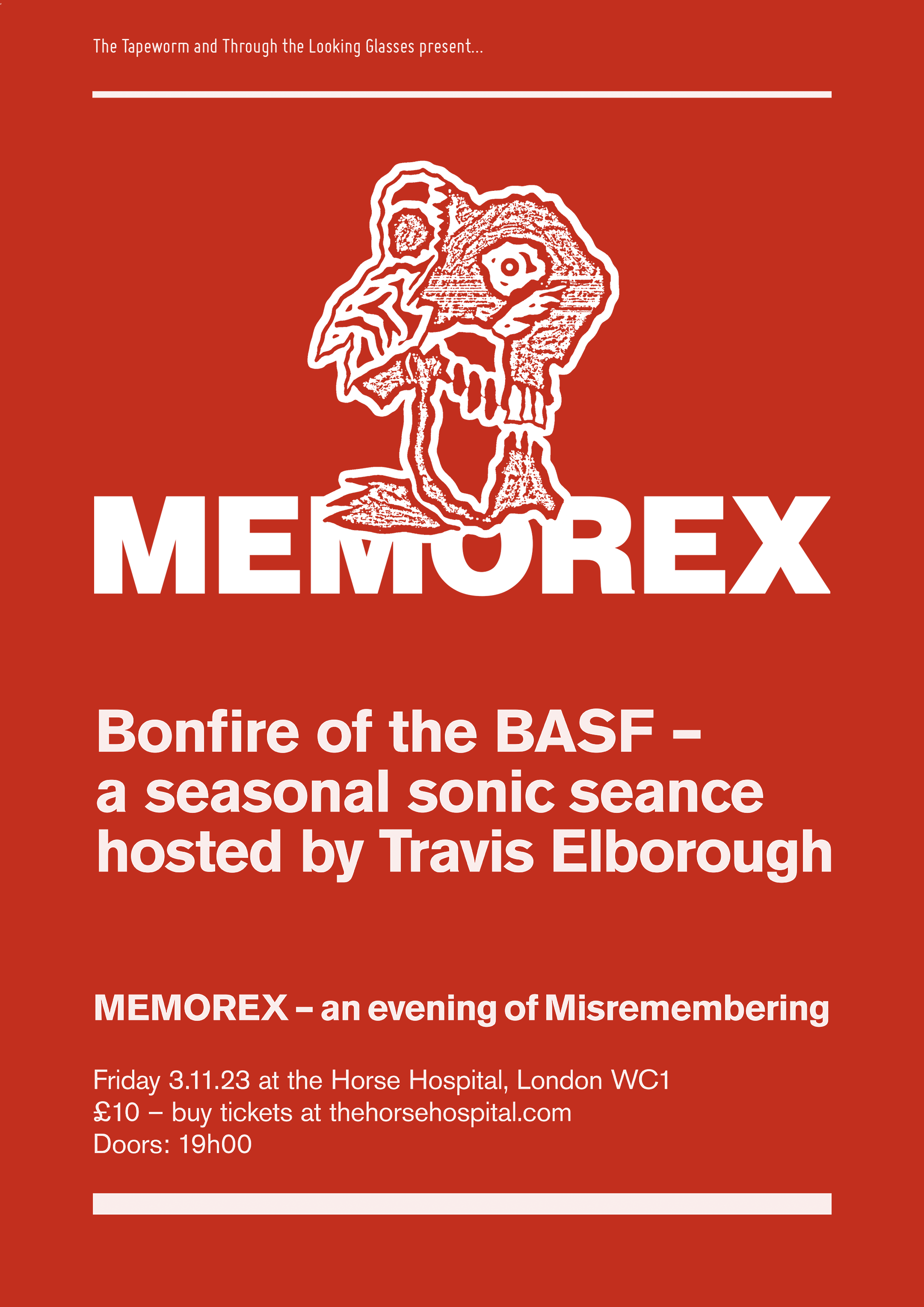 The very next day, Ken Hollings and I will roll out The Howling once more for MEMOREX: Bonfire of the BASF, an evening of ‘Misremembering’ at The Horse Hospital, hosted by Travis Elborough. Further delights come courtesy of a performance by dear old chum Kemper Norton, plus Ruth Bayer and Caroline Wise in conversation.