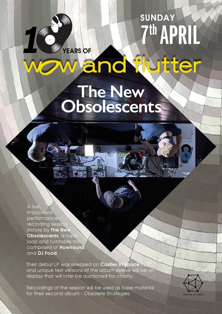 Hello You. Very excited to announce the return of The New Obsolescents, the tape loop and turntable trio I share with my two dear chums Chris Weaver and Strictly Kev aka DJ Food. Last seen providing a ‘spooky racket’ at the Levitation Festival in Whitby a couple of years ago (my memory for dates is growing increasingly hazy), for our next trick we’re hitting the coast and heading on down to Hastings on Sunday 7th April for The first in a series of events celebrating ten years of the Hastings record shop Wow And Flutter. This is a live, improvised performance/rehearsal/jam session conducted in-store during which we’re hoping to lay some of the groundwork for our long overdue second album, so if you’re in the area, do come down to cheer us along (and naturally indulge in some digging in the crates). Plus we’ll be displaying some unique test versions of the sleeves for our sold-out-in-five-minutes 2021 debut LP for Castles In Space, The Superceded Sounds Of The New Obsolescents. If you remember the album came in a choice of five sleeve designs hand-printed on the very last available consignment of mirrorboard card stock, so this might be the last time they ever appear in public…