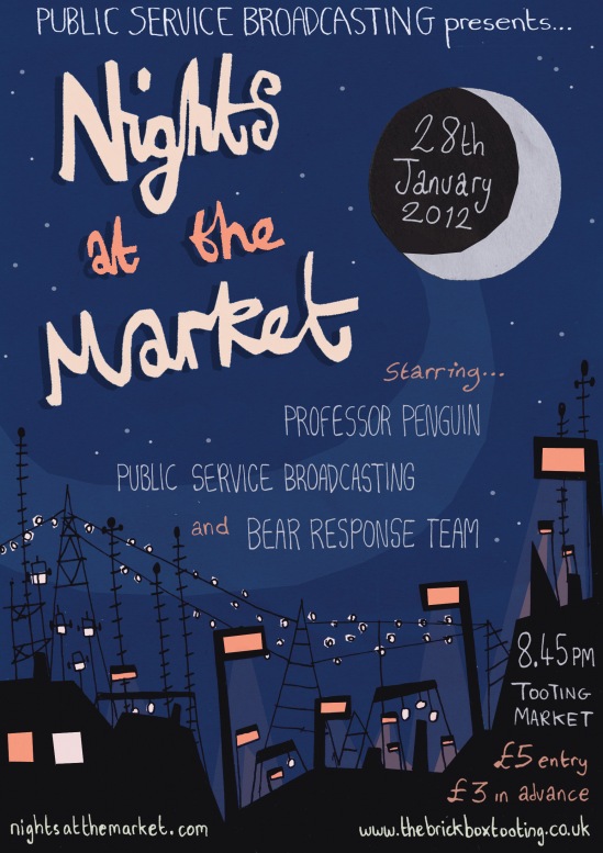 After all this gigging, they’re pretty on-point as a band right now. So what better time to invite you to check them out than this coming Saturday at the latest of their self-curated Nights At The Market events? The second in a continuing residency at Tooting Market in South London, the lineup includes the full PSB Stage Show, alt-pop from Professor Penguin and noisebeat pop from Bear Response Team. But that’s not all! I’m very pleased to inform you that Mr. Willigoose contacted me personally and asked if I would be willing to DJ at the event (on MSN Messenger, so it’s official). The decision to reply ‘Hell, yes, why didn’t you ask me sooner, smiley emoticon?!’ took all of three seconds.