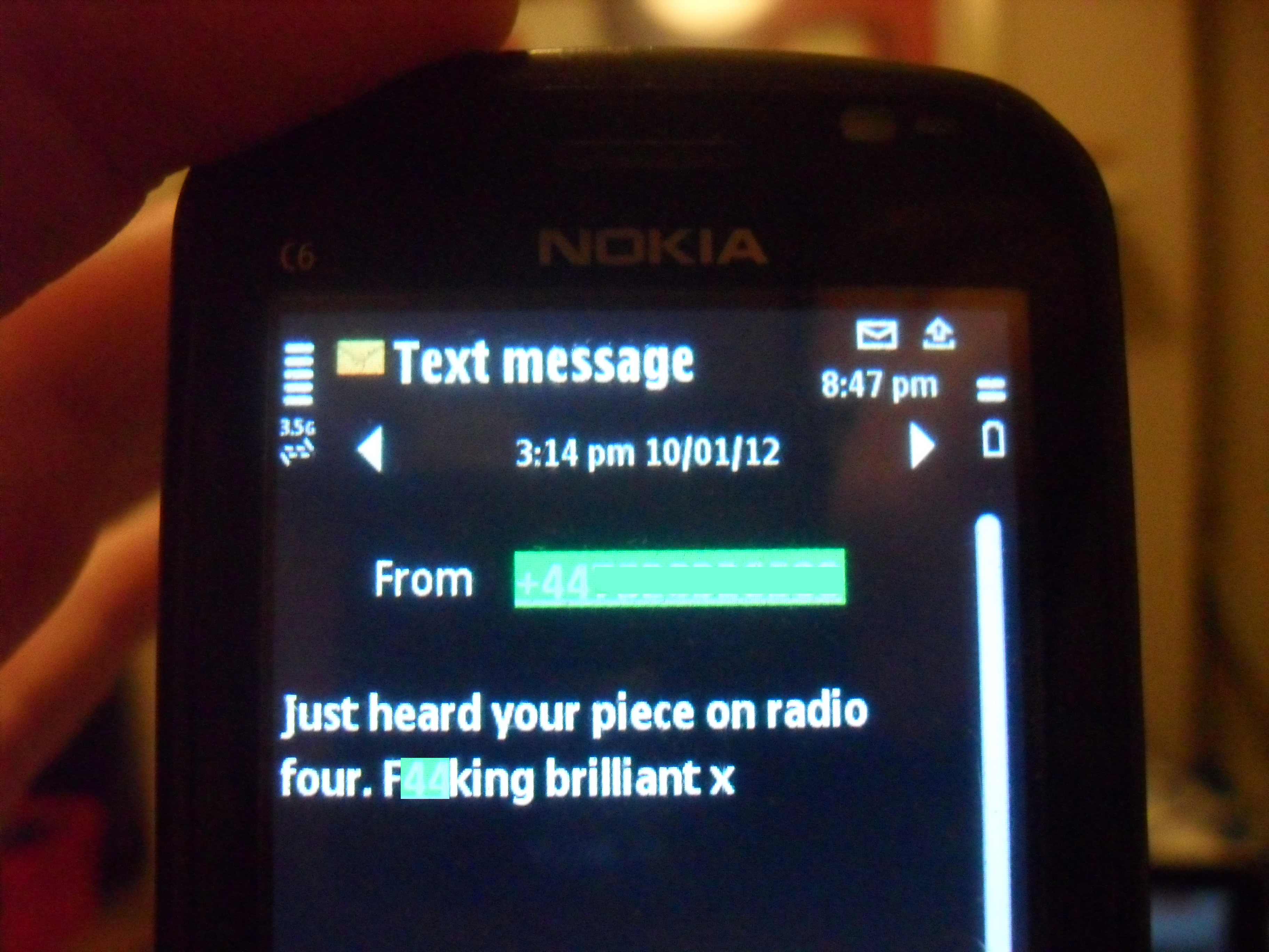 Thanks very much to everybody who sent such nice feedback, especially Marcella, the ‘falling off her chair laughing’ lady and Mr. Ed Lehan who sent what must be the best text message I’ve ever received!