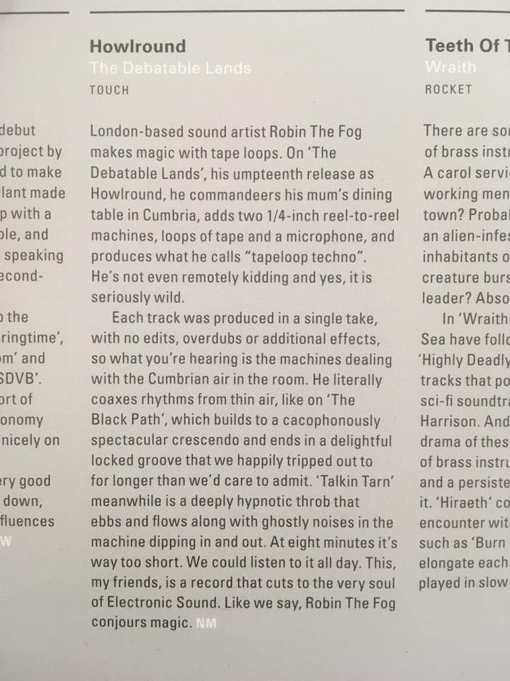 Secondly, huge thanks to Neil Mason for a glowing review of new Howlround LP The Debatable Lands in the latest issue of Electronic Sound magazine. First time I’ve ever had anyone describing my work using words like ‘magic’ and ‘seriously wild’ – and hopefully not the last time either!
