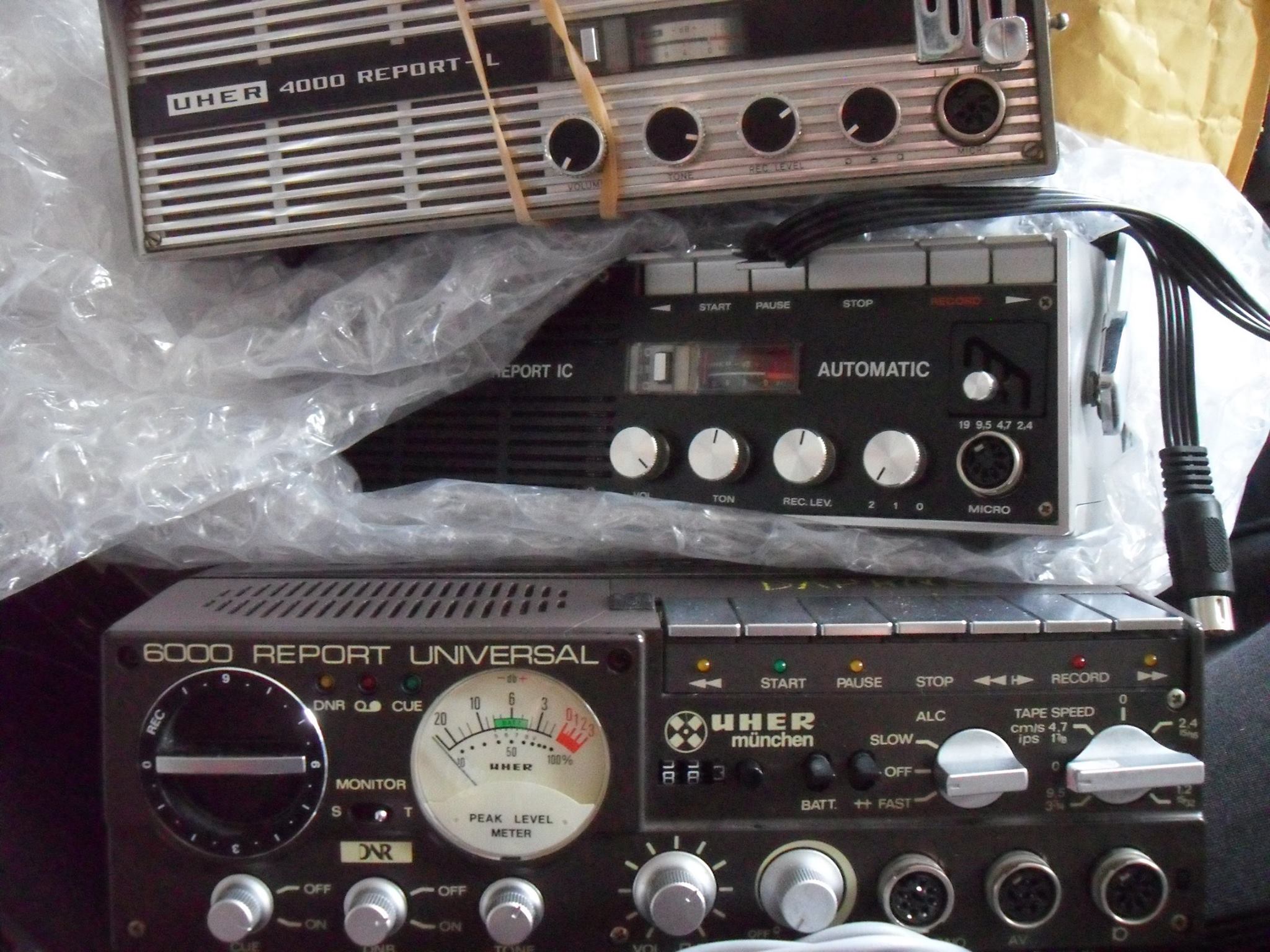 With our recently-acquired quartet of (comparatively) lightweight ‘reporter’-style machines, we’re hoping to massively increase our range and effectiveness as a live unit while massively decreasing the risk of damage to our spines, our heavy-yet fragile Revoxes and the walls and door-ways of my flat. From henceforth the plan is that these much-smaller UHERs will take on our live duties while the Revoxes remain permanently set-up in the Howlround studio, which will hopefully save lots of endless rigging and de-rigging every time we perform and increase our productivity by a factor of hundreds.